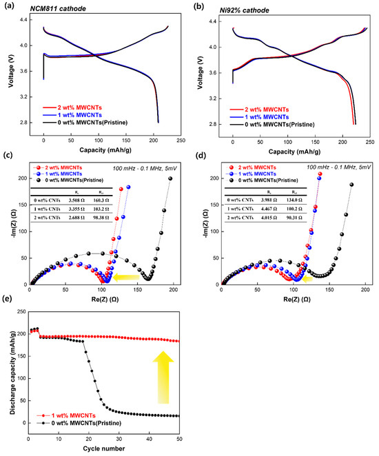 (a) Initial voltage profile at 0.1 C between 2.8 and 4.3 V vs. Li using NCM811 and (b) Ni92% cathode. EIS profiles of the Li half-cell with 0, 1, and 2 wt% MWCNTs using the (c) NCM811 and (d) Ni92% cathode. (e) Cycling performances of electrodes prepared with ratio of 88:2:10 (active material:conductive additive:binder material) in Li half-cell at 0.33 C (first three cycles at 0.1 C) between 2.8 and 4.3 V vs. Li.