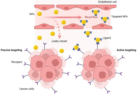 Schematic representation of active targeting vs. passive targeting of cancer cells by nano-delivery systems. In passive targeting, the size and surface properties of nanocarriers facilitate their accumulation within tumor tissues through the EPR effect, resulting from the leaky vasculature of tumors. Conversely, active targeting involves the conjugation of specific ligands to the NP surface, enabling targeted delivery to cancer cells by binding to overexpressed receptors or markers on their surface. Created with BioRender.com.