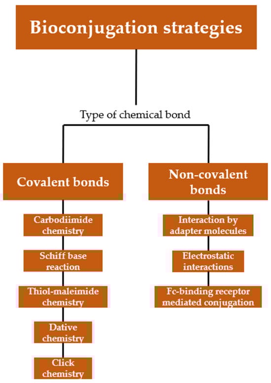 Classification of bioconjugation strategies based on covalent and non-covalent strategies.