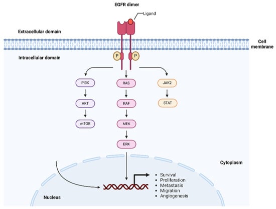 As all other members of the HER family, EGFR is a transmembrane protein, consisting of an extracellular domain (ECD), where the ligand binding site resides, a transmembrane domain (TMD), and an intracellular tyrosine kinase domain, which houses the catalytic activity of the receptor [62]. The ECD of EGFR is composed of two homologous domains, DI and DIII, involved in the ligand binding, and DII and DIV, that form disulfide bonds [63]. In an inactive state, the ECD has a tethered configuration, presenting intra-molecular bondages blocking the dimerization arm. Upon ligand binding to the ECD, the cytoplasmatic domain undergoes dimerization and phosphorylation, with the kinase activation being allowed by the configurational changes [64]. The EGFR activation leads to a cascade of subsequent downstream signal transduction pathways, resulting in the mitogenic and anti-apoptotic signal cascades [65]. Among those, the most important are the phosphatidylinositol-3-kinase (PI3K) signaling network, responsible for tumor growth, the RAS/MAPK pathway and the JAK2/STAT pathway (Figure 3) [66].