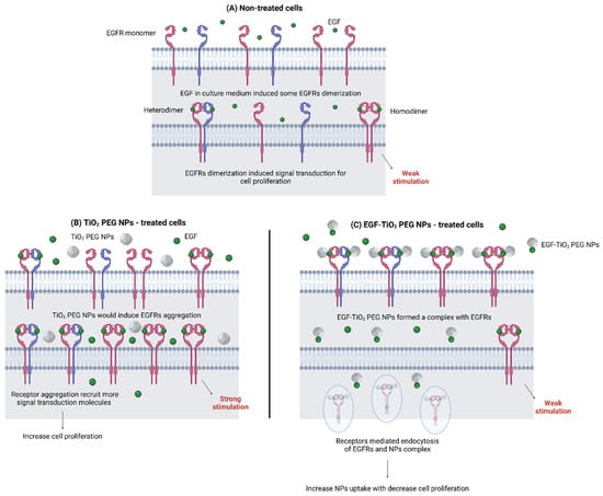 Molecular mechanism for the effect of EGF conjugation on TiO2 PEG NPs uptake levels and the cell proliferation effect via interaction with EGFRs proposed in [101]. (A) Non-treated A431 cells; (B) TiO2 PEG NPs-treated A431 cells; (C) EGF-TiO2 PEG NPs-treated cells. Created with BioRender.com.