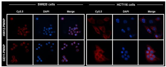Confocal microscopy images of bare PMNPs and GE11-PMNPs in red (Cy5.5), nucleus in blue (DAPI), and their combination (merged) in SW620 and HCT116 cells. Adapted with permission from [117]. Copyright 2020, American Chemical Society.