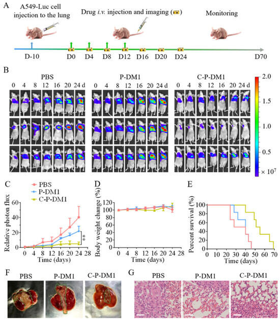 Therapeutic efficacy of C-P-DM1 in orthotopic A549-Luc NSCLC-bearing mice. (A) Establishment, therapy and monitoring scheme of the orthotopic A549-Luc NSCLC model. (B) Bioluminescence imaging and (C) quantitative bioluminescence levels of mice from day 0 to day 24 (n = 3). (D) Body weight change and (E) survival curves of mice (n = 6, C-P-DM1 vs. P-DM1 and PBS, ** p < 0.01). (F) Photographs and (G) H&E stained images of lung isolated from different groups on day 24. Scale bars are 50 μm. Adapted with permission from [157]. Copyright 2021, American Chemical Society.