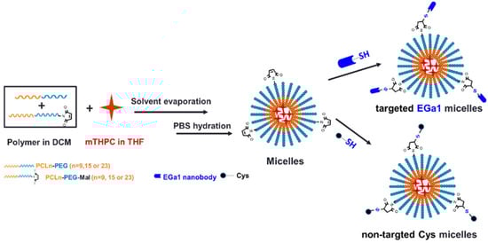 Preparation of polymeric micelles conjugated with EGa1 (targeted) or Cys (non-targeted). Adapted with permission from [209]. Copyright 2020, American Chemical Society.