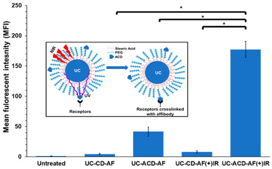 Mean fluorescent intensity from human colorectal Caco-2 cancer cells after incubation with Alexa Fluor 555-modified UC-ACD (targeted) and UC-CD (non-targeted), with and without NIR irradiation. MFI of UCNP-protein complex is 4.38 ± 0.32 times higher in the cells treated with UC-ACD-AF (+) IR than that of the non-irradiated control (UC-ACD-AF, n = 3, * p < 0.05). Inset: schematic showing the UC-ACD conjugate structure and the NIR activation of the UCNPs, followed by upconversion to UV, resulting in a photoreaction between the affibody-enzyme ACD and EGF receptors. This chemical association allows enzymatic conversion of systematically delivered prodrug 5-FC to active drug 5-FU at the cancer site. Adapted with permission from [227]. Copyright 2022, American Chemical Society.