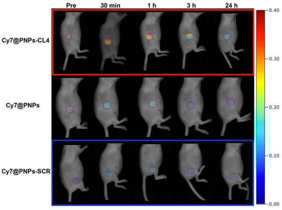 Selective tumor targeting of Cy7@PNPs-CL4 compared to Cy7@PNPs-SCR and Cy7@PNPs. Nude mice bearing subcutaneous MDA-MB-231 xenografts were i.v. injected with Cy7@PNPs-CL4, Cy7@PNPs or Cy7@PNPs-SCR (5 nmol Cy7/100 μL) and analyzed by in vivo FRI imaging at the indicated time points (i.e., Pre: before injection, 30 min, 1, 3 and 24 h acquisitions). Adapted from [256]. Copyright 2021, Springer Nature.