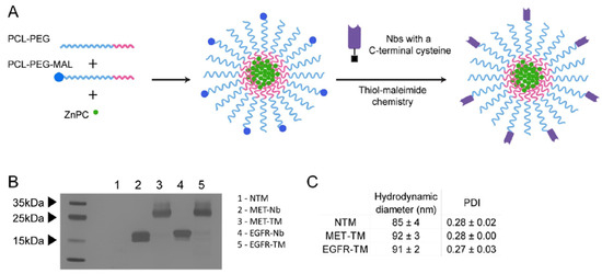 Liu et al. demonstrated the targeting ability of anti-EGFR Ega1 Nbs conjugated to micellar constructs loaded with meta-tetra(hydroxyphenyl)chlorin for selective PDT [209] (Figure 7). EGFR-mediated internalization was observed in A431 cells, resulting in enhanced cellular uptake and photocytotoxicity, as compared to control EGFR-low expressing HeLa cells. In vivo pharmacokinetics highlighted extended circulation of the micellar nanocarriers, as compared to the free drug.