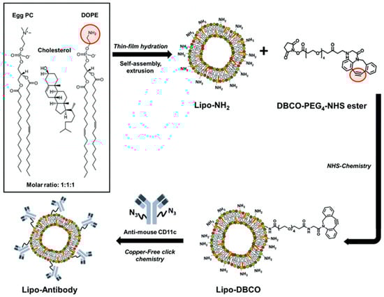 - Gai, M.; Simon, J.; Lieberwirth, I.; Mailänder, V.; Morsbach, S.; Landfester, K. A Bio-Orthogonal Functionalization Strategy for Site-Specific Coupling of Antibodies on Vesicle Surfaces after Self-Assembly. Polym. Chem. 2020, 11, 527–540. [Google Scholar] [CrossRef]