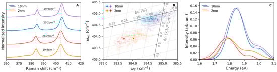 Raman spectra (A), strain variation Δε (B), and negative charge-carrier concentration variation Δn (C) of 1L-MoS2 flakes exfoliated on two different Au substrates of thickness equal to either 2 nm or 10 nm as a function of thermal treatment temperature. Points in panel (A) represent the experimental data, and the continuous lines represent the fits with Lorentzian bands.