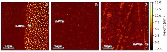 5 × 5 µm2 AFM morphology of a 1L-MoS2 flake exfoliated on a 10 nm thick Au substrate. The panels show the morphology of a sample in pristine conditions (A), after a 2 h thermal treatment carried out at 225 °C under a 2 bar O2 atmosphere (B), and after the same treatment was carried out at 300 °C (C). Regions associated with 1L-MoS2 and Au have been labeled accordingly.
