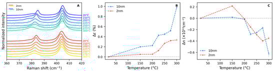 Raman spectroscopy can provide valuable insight into the processes occurring during the thermal treatments. Representative spectra of the treated flakes (Figure 3A) show that, as the temperature is increased, the E’ band exhibits a progressive redshift, indicative of the accumulation of tensile strain within the flakes. Concurrently, following treatments above 225 °C, the full width at half maximum (FWHM) of the spectra starts to increase (Figure 3A and Figure S8), evidencing the degradation previously observed in the optical microscopy images. From the shifts in the position of the E’ and A1’ bands, it is possible to calculate the variations in strain and doping of the treated flakes as a function of temperature, as shown in Figure 3B and Figure 3C, respectively. The obtained strain curve displays a progressive increase in tensile strain, especially occurring at temperatures above 225 °C. In particular, in the case of 1L-MoS2 flakes deposited on the thicker 10 nm gold substrate, a net (0.98 ± 0.04)% increase in strain was observed after the 300 °C thermal treatment. At the same time, starting from 225 °C, the negative charge-carrier concentration of the samples progressively declines with the temperature of the treatments, reaching (0.63 ± 0.05) × 1013 cm−2 for the flake deposited on the thicker 10 nm gold substrate and (0.35 ± 0.03) × 1013 cm−2 for the flake on the thinner 2 nm gold layer after the 300 °C thermal treatment. The spatial distribution of strain and doping across the samples as a function of temperature is shown in Figures S9 and S10 for the treated flakes deposited on the 10 nm thick and 2 nm thick gold substrates, respectively. These images indicate that the variations occur homogeneously across both the inner part of the flake and its edges.