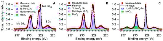 High-resolution Mo 3d XPS spectra of 1L-MoS2 flakes exfoliated on a 10 nm thick Au substrate. (A) XPS spectrum of the pristine sample, (B) after a 2 h thermal treatment at 225 °C under a 2 bar O2 atmosphere, and (C) after the same treatment at 300 °C (right).