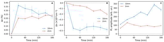 Strain variation Δε (A), negative charge-carrier concentration variation Δn (B), and cumulative PL amplitude (C) as a function of thermal treatment duration of 1L-MoS2 flakes exfoliated on two different Au substrates of thickness equal to 2 nm and 10 nm.