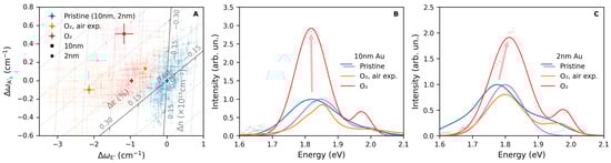 Considering the PL exhibited by 1L-MoS2, as shown in Figure 6B,C, it can be observed that there is no increase in intensity when the samples are exposed to the ambient atmosphere while still at a high temperature. On the other hand, as previously observed, the PL of the samples increases when the flakes are not exposed to air. Additionally, in the case of the sample deposited on a 2 nm Au substrate, a blueshift of the A band equal to 0.05 eV was observed after the thermal treatment carried out without air exposure. Such a shift was not found in the other samples. These results suggest that the variations in tensile strain and negative charge carrier concentration are not the main factors for the observed increase in the flakes’ PL intensity. If this were the case, similar variations in strain and doping occurring in the flakes after thermal treatment would otherwise result in a comparable enhancement of the PL. The average variations in strain, doping, and relative PL amplitude compared to the pristine flakes after the thermal treatments are presented for all flakes in Table 1 for both thermal processes carried out with and without exposure to the ambient environment.