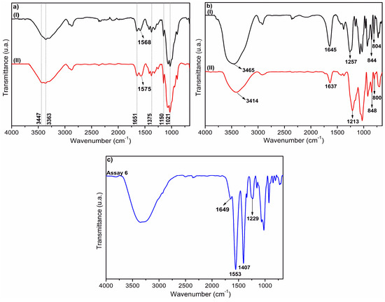 Figure 2a presents the FTIR-ATR spectra of chitosan. Both spectra before and after purification exhibit similar bands, which is characteristic of the chemical structure of this polysaccharide. The profiles are similar in terms of band intensity and wavenumber assignment. The stretching (O–H and N–H) occurs at 3447 and 3363 cm−1. The band at 1651 cm−1 is attributed to the asymmetric stretching of the N–C=O bonds of amide I, deriving from the acetylated units of chitin that remain in chitosan. The band at 1568 cm−1 (FTIR-ATR spectrum (I) for unpurified chitosan) and 1575 cm−1 (FTIR-ATR spectrum (II) for purified chitosan) results from the bending deformation of the N-H bonds combined with the stretching of the C–N bond (Figure 2a). The band at 1375 cm−1 is attributed to the angular deformation of the C-H bonds in the methyl groups of the acetamide moieties. In the range between 1150 and 1021 cm−1, stretching of the C–O bonds of primary alcohols and C-O-C bonds of ether groups are observed [47,48,49].