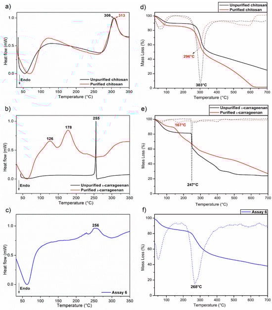 DSC curves: Chitosan (a), ι-carrageenan (b), and ι-carrageenan/chitosan precipitate obtained from assay 6 (c). TGA curves: chitosan (d), ι-carrageenan (e), and ι-carrageenan/chitosan precipitate obtained from assay 6 (f). The dashed lines in (d–f) represent the first derivative of the TG curves. Experimental conditions of assay 6: pH 4.4, purified ι-carrageenan at 0.3 mg/mL, purified chitosan at 0.3 mg/mL, polycation/polyanion volume ratio of 2, and mass ratio of 66.6/33.4.