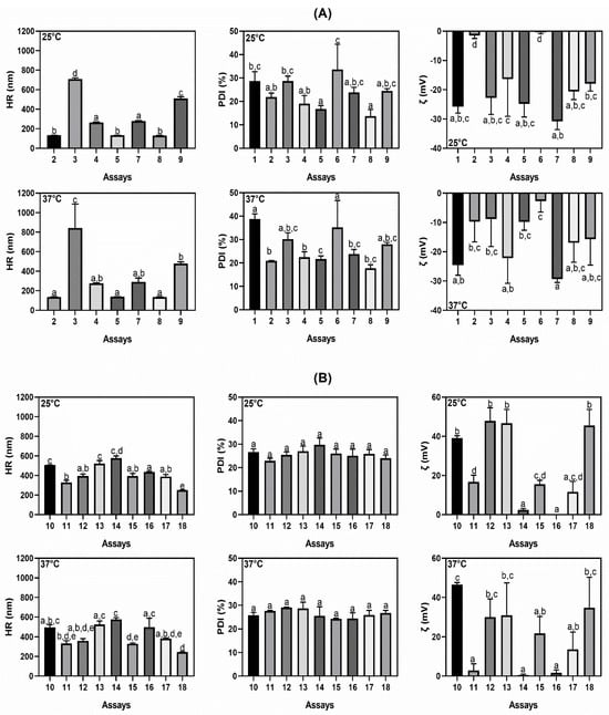 Comparison of DLS results: Measurements of the hydrodynamic radius (HR) or average wet diameter of particles in suspension, zeta potential (ζ, mV) of particles in suspension, and polydispersity index (PDI, %) of particles in suspension. Measurements were taken at 25 °C and 37 °C with three replicates (n = 3). (A) represents samples with excess ι-carrageenan (Table 4), and (B) shows samples with excess chitosan (Table 5). Different lower-case letters in Figure 4 indicate significant differences between the measurements (p ≤ 0.05).