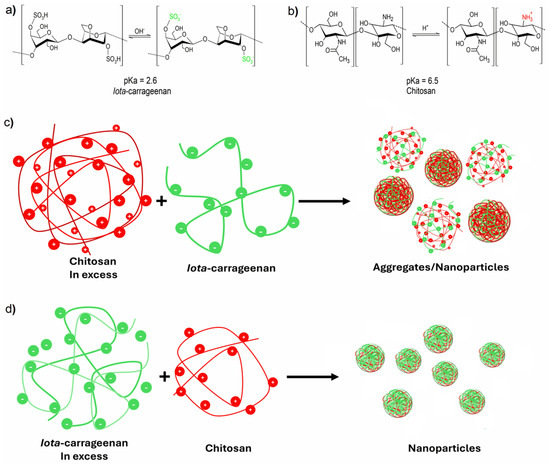 Scheme 1 depicts the chemical structures of the polysaccharides ι-carrageenan and chitosan, highlighting the species that coexist in equilibrium within aqueous solutions of these polysaccharides (Scheme 1a,b). Scheme 1c illustrates the effect of increasing particle size when prepared with higher concentrations of chitosan. As the pH increases, the chitosan chains become partially deprotonated, leading to a higher −NH2/-NH3+ ratio. This intensifies intermolecular hydrogen bonding interactions, promoting particle aggregation (Scheme 1c). An opposite effect is observed when the concentration of polyanion is higher. In this case, the increase in pH induces partial deprotonation of the ι-carrageenan chains. This enhances the negative charge density on the particles, increasing their stability and preventing aggregation (Scheme 1d).