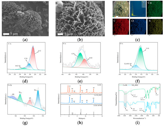 (a,b) SEM images of Cu-BL at different resolutions; (c) EDS elemental mappings of Cu, C, N, and O; (d) high-resolution XPS spectra of C 1s, (e) N 1s, (f) O 1s, and (g) Cu 2p; (h) XRD patterns; and (i) FT-IR spectra.