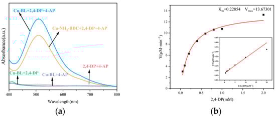 To determine the reaction kinetics, 2,4-DP with initial concentrations of 0.05, 0.1, 0.2, 0.4, 0.6, 0.8, 1.0, and 2.0 mM was reacted with 4-AP in the aqueous suspension of Cu-BL in MES buffer. The initial rate of the reaction was calculated by conversion using the Lambert–Beer law (the molar extinction coefficient of the product, 13.6 mM−1 cm−1) with the Michaelis–Menten equation, shown in Equation (1):
