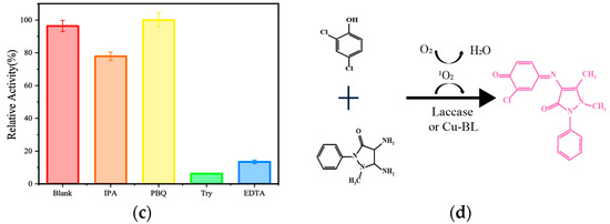 In addition, laccase-like activity may come from the ability of Cu-BL to catalyze the generation of reactive oxygen species (ROS). The ROS method was used to determine the reactive intermediates. Hydroxyl radicals (·OH) could be captured by isopropanol. P-Benzoquinone was used to quench O2−·, L-tryptophan was used to quench 1O2, and EDTA was used as an oxygen vacancy scavenger. Figure 2c shows that there was no significant difference in the absorption of the systems with IPA and PBQ as scavengers compared with that of the group without scavengers, indicating that there were no ·OH and O2−·. In the case where L-tryptophan or EDTA was used as a scavenger, the absorption was significantly reduced. Therefore, we determined that 1O2 and oxygen vacancies were the main reactive intermediates in the laccase-like catalytic reaction. Thus, the laccase-like catalytic behavior of Cu-BL is shown in Figure 2d.