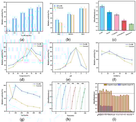 Laccase-like relative activities of Cu-BL and free laccase under different conditions. (a) Different concentrations of Cu-BL; (b) different buffer solutions; (c) for different phenolic substrates, different (d) temperatures, and (e) pH values. (f) In the mixture of ethanol and water; (g) different concentrations of NaCl; (h) catalytic activities after six cycles; and (i) selectivity and anti-interference analysis of Cu-BL detection.
