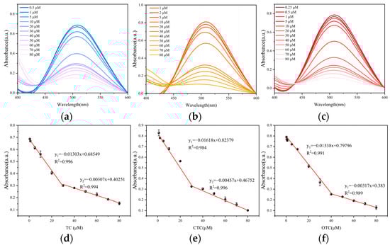 In order to evaluate the ultraviolet detection performance of TCs, the ultraviolet–visible absorbance of different concentrations of TCs at 510 nm was measured. As shown in Figure 4a–c, because of their similar chemical structures, their responses to these three TCs are similar. With the increase in the concentration of TCs, the ultraviolet absorbance at 510 nm gradually decreased. As shown in Figure 4d–f, there was a linear relationship between the absorbance of the Cu-BL detection system at 510 nm and the concentration of TCs. As the dose of TC increased, the color change could also be seen with the naked eye, gradually changing from pink to colorless. The linear ranges of the ultraviolet absorbance measured for TC, CTC, and OTC were 0.5–30–80 µM, 1–30–80 µM, and 0.25–40–80 µM, respectively, and all exhibited a two-segment linear relationship. It is speculated that in the first low-concentration range, the active sites of the Cu-BL nanoenzyme were relatively sufficient, and the binding probability of each TC molecule to the active sites of the nanoenzyme was relatively high. After TCs reached the second high-concentration range, the TC molecules bound to the nanoenzyme were close to saturation, and the competitive inhibition effect on the substrate gradually weakened, resulting in a slower decrease in absorbance. At the same time, based on the three-sigma rule (S/N = 3), the limits of detection (LOD) for TC, CTC, and OTC were 0.27 µM, 0.22 µM, and 0.26 µM, respectively. These results strongly indicate that the Cu-BL detection system has a satisfactory and relatively wide linear range under low-concentration conditions, thereby showing potential for practical application. When compared with other detection methods, the Cu-BL detection system performs similarly or better. Although some reported methods exhibit higher sensitivity or a wider linear range, our method features a simpler analysis process, lower cost, and reliable analysis results.