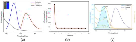 Fluorescence quenching mainly includes static quenching [37], dynamic quenching [38], fluorescence resonance energy transfer (FRET) [39], photo-induced electron transfer (PET) [40], and the inner filter effect (IFE) [41]. To check the fluorescence quenching mechanism, the ultraviolet absorption spectra of TC solutions with different concentrations were recorded and compared with the fluorescence spectrum of Cu-BL. As shown in Figure 5c, the absorbance of TC at 350 nm had a good overlap with the fluorescence spectrum of Cu-BL. As the TC concentration increased, the overlapping proportion expanded, indicating that the quenching effect might be due to the inner filter effect (IFE) [42].