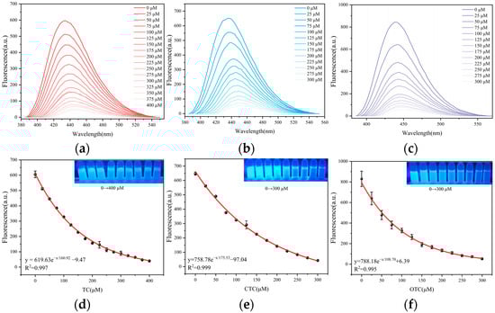 As shown in Figure 6a–c, in the mixed solution of Cu-BL and TCs, the fluorescence intensity at 440 nm (F440 nm) decreased significantly with the increase in TC concentration. It could be observed with the naked eye that as the concentration of TCs increased, the obvious fluorescence gradually weakened until there was almost no fluorescence. The corresponding calibration curves are shown in Figure 6d–f. The concentrations of TCs and the fluorescence absorption intensities all conformed to the ExpDec1 model (y = A× exp(−x/t) + y0). Among them, the linear range of TC was 0–400 µM with a correlation coefficient of 0.997; the linear range of CTC was 0–300 µM with a correlation coefficient of 0.999; and the linear range of OTC was 0–300 µM with a correlation coefficient of 0.995.