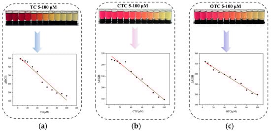 The rapid analysis and visualization of TCs are crucial for environmental monitoring and food safety control. Therefore, a more portable visual analysis method based on smartphones, integrating colorimetric and fluorescence modes, was developed. The smartphone’s camera captured the color changes in the Cu-BL detection system with different concentrations of TCs added (Figure 7). The Colorimetric Titration software extracted the corresponding RGB values from the images. In the range of 5–100 μM, the ΔRGB values were linearly related to the concentrations of TCs, and the regression equations were y1 = −2.08 CTC + 372.14 (R2 = 0.9607), y2 = −1.60 CCTC + 317.52 (R2 = 0.9739), and y3 = −1.60 COTC + 332.31 (R2 = 0.9842).