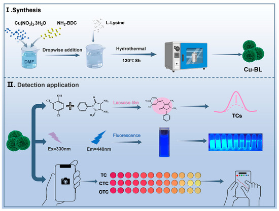 Several quantitative analysis methods for TCs have been developed [7,8,9,10,11,12,13]. Although they have strong analytical parameters, they also have some obvious shortcomings. For example, the limitation of this very sensitive technology in practical use lies in the need for complex sample processing and skilled personnel, as well as their expensive equipment, expert operation, and complicated procedures. In addition, they are only in one detection mode and are easily affected by test conditions. In recent years, practical portable biosensors for detecting TCs have drawn significant attention. These biosensors are based on colorimetric or fluorescent detection with natural enzymes as the core components due to the high activity and selectivity of enzymes. However, natural enzymes are quite fragile and not applicable in complex environments. To address this limitation, nanoenzyme-based sensors have emerged. Thanks to their advantages like good stability, high activity, easy preparation, convenient operation, and low cost [14,15,16], they are widely used in the detection of drug molecules [17], heavy metal ions [18], and tumor markers [19], as well as in cancer treatment [20] and anti-bacteria [21] applications. Inspired by the structure of laccase, most studies use copper as the core element of the active substance and combine it with appropriate ligands to catalyze substrates by simulating the multi-copper coordination environment [22,23,24,25]. For example, Wang et al. [26], based on the peroxide activity of Fe3O4@Cu nanoparticles and “sandwich” oligonucleotide hybridization technology, developed a new type of tetracycline colorimetric sensor with high sensitivity and successfully applied it to the high-sensitivity detection of TC in milk samples. Wu et al. [27] used copper chloride dihydrate as the copper source, sodium borohydride as a reducing agent, and β-cyclodextrin as a protective agent to synthesize copper nanoenzymes (CuNZs) with good laccase activity by a grinding method. A rapid and simple OTC colorimetric determination method was established by using the laccase-like activity of CuNZs.