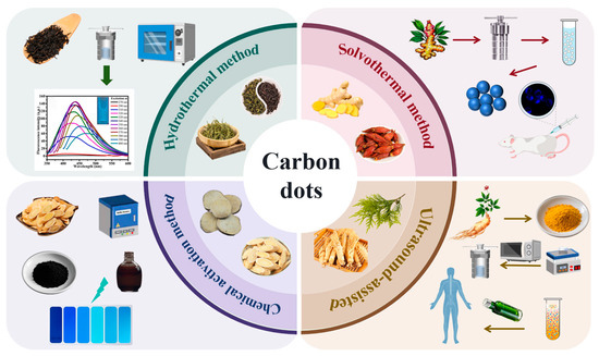 The pyrolysis method is a reliable and simple way to prepare green carbon dots. By heating carbon precursors and then separating and purifying them, carbon dots are obtained. Carbonization, an eco-friendly process, entails pyrolyzing organic materials in inert gas. Han et al. [103] carbonized traditional Chinese medicines like cattail pollen, lotus node, Cirsium japonicum charcoal, and hair at 300–450 °C. The resultant carbon dots had good biocompatibility and hemostatic effects, influencing both intrinsic and extrinsic coagulation pathways to shorten the clotting time. Chen et al. [114] processed astragalus membranaceus (washed, dried, and pulverized) via pyrolysis at 200 °C for 18 h. The obtained carbon dots were nearly spherical, with an average diameter of 10.14 ± 0.30 nm, a graphene-like structure, and −OH, −COOH groups on the surface. They had a 15.8% fluorescence quantum yield, plus good photostability, ionic strength stability, and thermal stability. They performed well in degrading malachite green (89% efficiency without light) and were used in HeLa cell imaging. Chai et al. [111] synthesized carbon dots from marigold and doped them with ethylenediamine, achieving a 7.84% quantum yield. Chen et al. [114] made CDs from carbonized watermelon rind, which were thermally stable at pH 2–11, 2 nm in diameter, and had a 7.1% quantum yield. Chen et al. [115] produced green CDs with a 19.3% quantum yield using carbonized sweet peppers. Bayda et al. [116] used black tea as a carbon precursor for CDs as drug delivery carriers. This method exploits the natural components and medicinal properties of Chinese herbs, offering a new source of biomass for carbon dot synthesis. The synthesized carbon dots have potential in biomedicine, with better biocompatibility and unique physiological activities than traditional chemical synthesis (Figure 7).