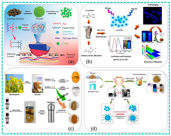 Preparation of conductive hydrogels for accelerating wound healing (a) (Hu et al., 2024 [99]); detection of baicalein CDs by hydrothermal synthesis (b) (Cheng et al., 2024 [2]); CDs from bee pollen using one-step hydrothermal method (c) (Shan et al., 2022 [81]); schematic production of hydrothermal CDs from soybean meal (d) (Guo et al., 2021 [67]).