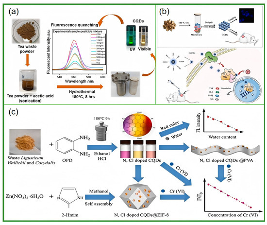 Waste tea CDs were prepared by solvent thermal method for pesticide testing (a) (Sinha et al., 2024 [60]); ginger-derived CDs accelerated wound healing (b) (Li et al., 2023 [104]); and one-pot solvent thermal preparation of seaweed CDs for detecting Cr (VI) (c) (Zhang et al., 2023 [100]).