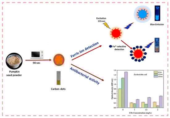 - Selvaraj, H.; Bruntha, G.; Ilangovan, A. Synthesis of carbon dots via microwave-assisted process: Specific sensing of Fe (III) and antibacterial activity. J. Fluoresc. 2024, 1–11. [Google Scholar] [CrossRef]
