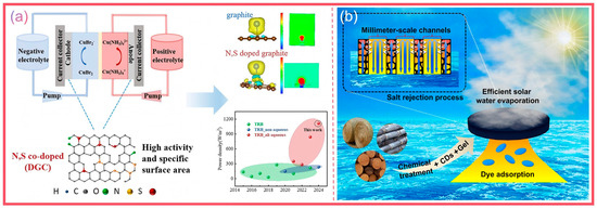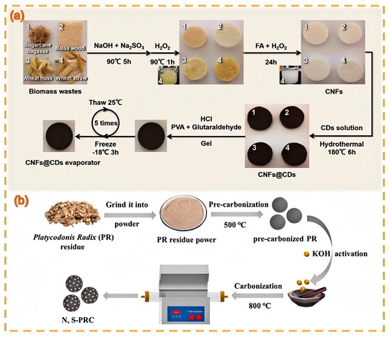 Co-doped ginger-derived porous carbon electrode (a) (Li et al., 2024 [134]); CDs prepared using bagasse, wheat husk, and wheat straw for battery energy storage (b) (Wang et al., 2022 [126]).