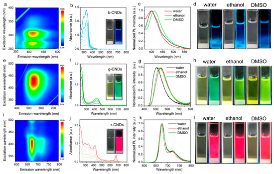Honeysuckle, turmeric, and Perilla leaves synthesized using CDs based on the blue, green, and red fluorescence of biomass, as shown in the Figure, (Zhao et al., 2021 [90]). ((a) Excitation-emission contour plots of the b-CNDs; (b) UV-vis absorption spectra of the b-CNDs, The insets are the images of CNDs under sunlight and 365 nm excitation; (c) The PL spectra of modified b-CNDs are dispersed in water, ethanol and DMSO; (d) the corresponding images under sunlight and 365 nm excitation; (e) Excitation-emission contour plots of the g-CNDs; (f) UV-vis absorption spectra of the g-CNDs; (g) PL spectra of g-CNDs dispersed in different solvents; (h) Image of g-CNDs dispersed in different solvents; (i) Excitation-emission contour plots of the r-CNDs; (j) UV-vis absorption spectra of the r-CNDs; (k) PL spectra of r-CNDs dispersed in different solvents; (l) Image of r-CNDs dispersed in different solvents).