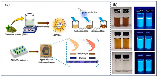 CDs were prepared from green tea powder for real-time freshness detection of shrimp packaging (a) (Khan et al., 2023 [59]); CDs with blue fluorescence (b) (Guo et al., 2021 [67]).