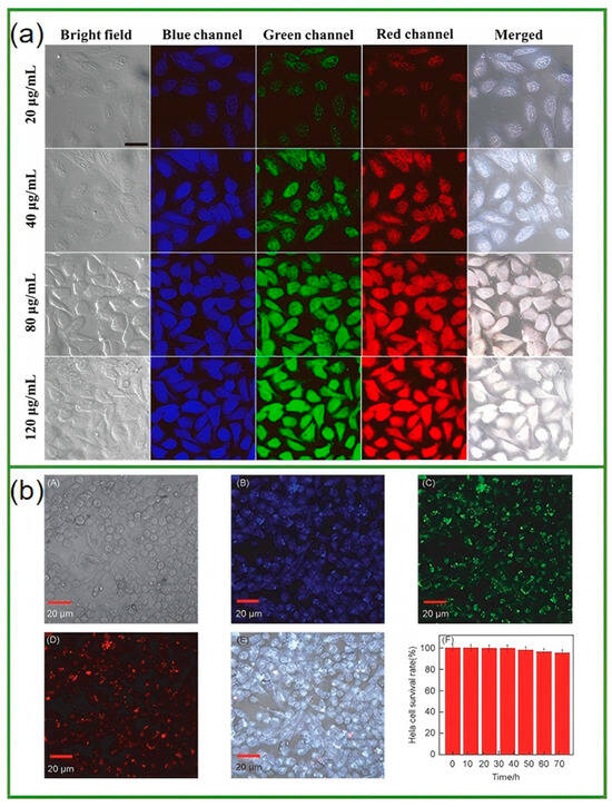 CLSM fluorescence images of HeLa cells incubated with different concentrations of N, P-CDs (20, 40, 80, and 120 μg mL⁻1). The scale bar is 20 µm. (a) Taken from Qin et al., 2023 [108]; fluorescence microscopic images of HeLa cells incubated with CDs at 37 °C. (b) (Hao et al., 2022 [101]). ((A) Bright field image; (B–D) fluorescence images taken on exciter filters: excitation 340 nm(blue), excitation 460 nm (green), excitation 520 nm (red), respectively; (E) merged images of HeLa cells in bright field and fluorescence mode; (F) HeLa cell survival rate).