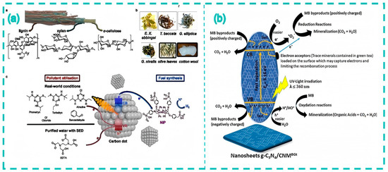 CDs using lignocellulose for the photocatalytic degradation of organic pollutants (a) (Achilleos et al., 2024 [131]); CDs from green tea for the photodegradation of pollutants (b) (Djoko et al., 2020 [64]).