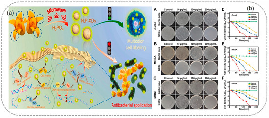 CDs prepared from mango peel were used to explore the antimicrobial mechanism of E. coli and S. aureus (a) (Hua et al., 2023 [108]), and hydrothermal synthetic CDs derived from garlic were used for antimicrobial activity (b) [(A–F) Bactericidal effect of garlic juice and GCDs on (A) E. coli, (B) MRSA, and (C) MRST. Time-kill curves of GCDs for (D) E. coli, (E) MRSA, and (F) MRST. (n = 3, mean ± SD)] (Selvaraj et al., 2024 [110]).