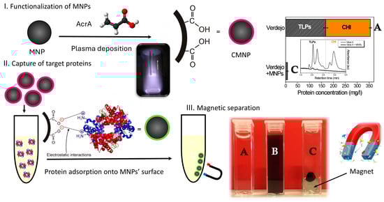 Schematic representation of the magnetic separation process for removing pathogenesis-related proteins from wine: (I) functionalization of MNPs using plasma deposition of acrylic acid; (II) capture of pathogenesis-related proteins, such as thaumatin-like proteins (TLPs) and chitinases (CHIs), from white wine, demonstrated using Verdejo wine as an example; (III) separation of pathogenesis-related proteins from wine by applying an external magnetic field. The photo with the red background illustrates A wine before treatment, B wine with dispersed MNPs, and C wine after the application of the magnetic field. Reprinted/adapted with permission from Ref. [69]. Copyright 2017, Elsevier.