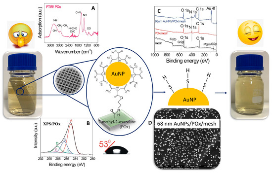 Schematic illustration of the generation of smart surfaces and their use in wine. (A–C) show the physicochemical properties of the coatings. (A) FTIR spectrum of 2-methyl-2-oxazoline coating deposited on KBr. (B) High-resolution C1s XPS spectrum of 2-methyl-2-oxazoline coating. (C) XPS survey spectra showing the surface chemical composition of uncoated mesh surfaces, mesh surfaces coated with POx, and mesh surfaces coated with POx and modified with 68 nm gold nanoparticles. (D) SEM image of 68 nm gold nanoparticles immobilized on POx deposited on a mesh surface. Reprinted/adapted with permission from Ref. [74]. Copyright 2023, Elsevier.