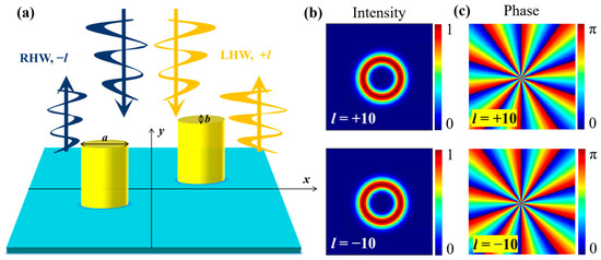 Therefore, the LHW and RHW vortex beams have the same diameter d which increases with increasing topological charge |l|. As an example, Figure 1b,c illustrate the distributions of intensities and phases of the Laguerre-Gaussian vortex beams characterized by l = +10 and −10. Obviously, their intensity distributions are the same, while their phase distributions are totally inverse, manifesting the fundamental characteristics of LHW and RHW vortex beams carrying opposite topological charges.