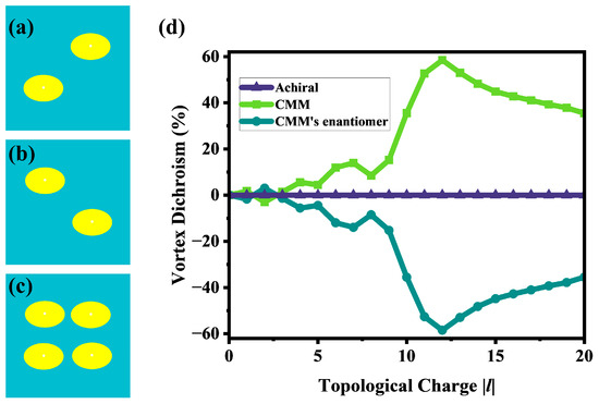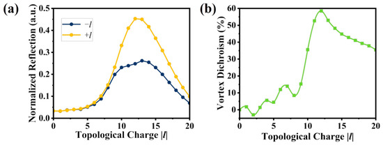 According to Formula (3) and Figure 2a, the VD spectrum for the designed CMM is calculated and shown in Figure 2b. The VD values are always positive for 0 < |l| < 20. With increasing |l|, the VD value firstly increases slowly (when |l| < 10), then ascends steeply to a peak of about 58.5% at |l| = 12 and finally descends slowly. Compared to the 20% vortex dichroism reported [31], our structure achieves a significantly higher VD of 58.5%, which is attributed to the optimized geometry and enhanced light–matter interaction. Besides, the oscillatory behavior from l = 0 to 9 can be explained as follows. For low values of l, the beam width is relatively small, and the spatial overlap between the vortex beam and the chiral structure is not optimal. As a result, the interaction between the vortex beam and the CMM is weak, leading to small difference between the normalized reflections for +l and −l and thus the observed oscillations.