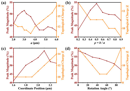 VD peak curve (red) and the corresponding topological charge curve |l| (orange) obtained by adjusting different geometric parameters. (a) The case of changing major axis of the elliptical rod; (b) the case of changing ρ; (c) the case of changing the coordinate positions of the two elliptical rods; and (d) the case of changing the rotation angle.