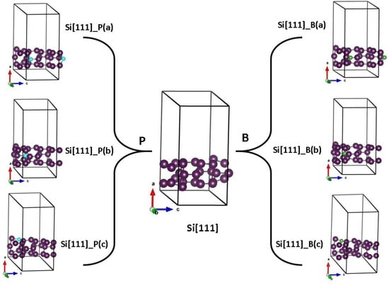 Theoretical studies of P-doped [100] SiNWs with a semi-continuum model indicated that Young’s modulus significantly decreases with the reduction in the nanowire’s width and thickness and with rising temperature []. First-principles studies have, to the best of our knowledge, been restricted to doped silicon nanocrystals [,,]. As the size of Si-NCs decreases, dopant atoms like B and P tend to migrate towards the surface, leading to significant alterations in the electronic structure and optical properties [] and the local bonding motifs and electron distributions in the frontier orbitals deviate significantly from the ones of pristine nanoclusters [], also upon co-doping [].