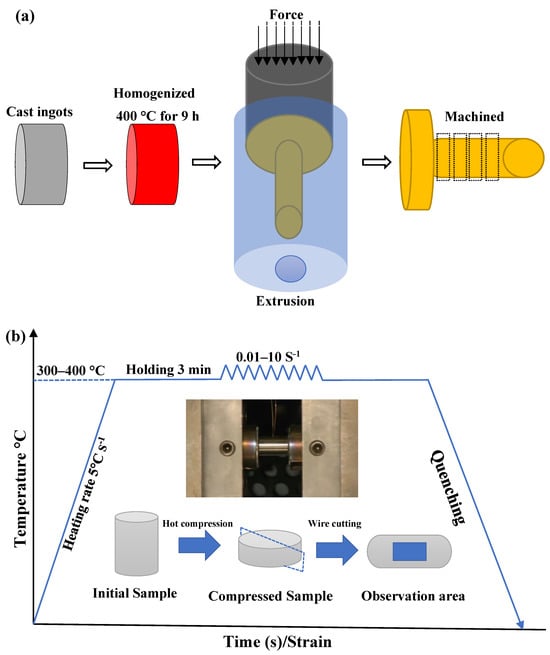 The BN-reinforced magnesium composite used in this study was synthesized by incorporating BN particles into the AZ80 magnesium alloy. The BN particles used as reinforcement in the AZ80 magnesium composite were supplied by a commercial source, with a purity of 99.99%. The average particle size was approximately 5 μm, confirming their microscale nature. This microscale size facilitates a uniform dispersion within the AZ80 matrix, enhancing the composite’s mechanical and thermal properties. The high aspect ratio and thermal stability of these BN microparticles contribute significantly to the observed improvements in peak stress and microstructural stability under elevated temperatures. The base alloy was melted in a resistive electric furnace under a protective argon gas mixture to prevent oxidation. Once the alloy reached the melting temperature of 720 °C, BN particles were introduced and thoroughly stirred to ensure homogeneous dispersion within the composite. The molten composite was poured into a steel mold and allowed to cool to room temperature. The resulting ingots were divided into cylindrical specimens measuring 17 mm in diameter and 30 mm in height. These specimens underwent a solution treatment at 400 °C for 9 h, followed by aging at 200 °C for 30 min, and were subsequently air-quenched to room temperature in preparation for hot extrusion. A graphite lubricant was applied to both the billet and the die to minimize friction and prevent wear during the extrusion process. An extrusion ratio of 4.52:1 was used to ensure optimal mechanical properties and a uniform microstructure. Finally, cylindrical samples measuring 8 mm in diameter and 10 mm in height were machined from the extruded material for compression testing. Figure 1a provides a schematic of the mold structure and the process workflow, from casting to machining. The chemical compositions (wt.%) of the experimental materials are as follows: AZ80 alloy: Al 8.16%, Zn 0.42%, Mn 0.30%, balance Mg; and AZ80-BN composite: Al 4.55%, Zn 0.25%, BN 0.51%, Mn 0.18%, balance Mg.