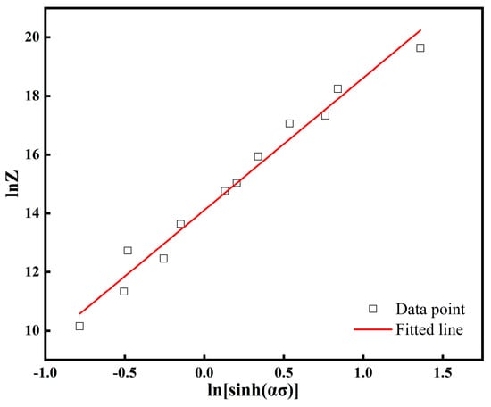 where represents the strain rate. Under high strain rate conditions, achieving a steady state is challenging, so σ is taken as the peak stress (MPa). Q denotes the deformation activation energy (J/mol), while A, A1, A2, β, n, n1, and α (α = n1/β, MPa−1) are material parameters. R is the universal gas constant, and T refers to the deformation temperature in Kelvin (K).