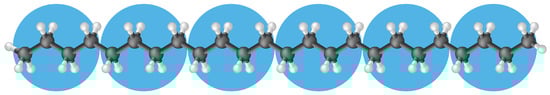 The CG model of PE employs a 4:1 level of CG resolution that maps four consecutive backbone carbon atoms and the corresponding hydrogen atoms into a single bead [37]. As illustrated in Figure 1, a PE oligomer, C24H50, containing 12 monomers (74 atoms), is represented by 6 tangentially bonded beads, with each bead representing two monomers.